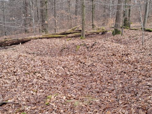 Zwischen den beiden Vulkanembryos Engelberg und Spitzberg geht es in Richtung Frickenhausen durch das Eisenerzabbau- und -Verhüttungsgebiet in den Gemarkungen Trauf und Benzenhau. Wir sehen uns die Pingen der alten Gruben und Schlackenhalden der Verhüttungsplätze im Wald an.